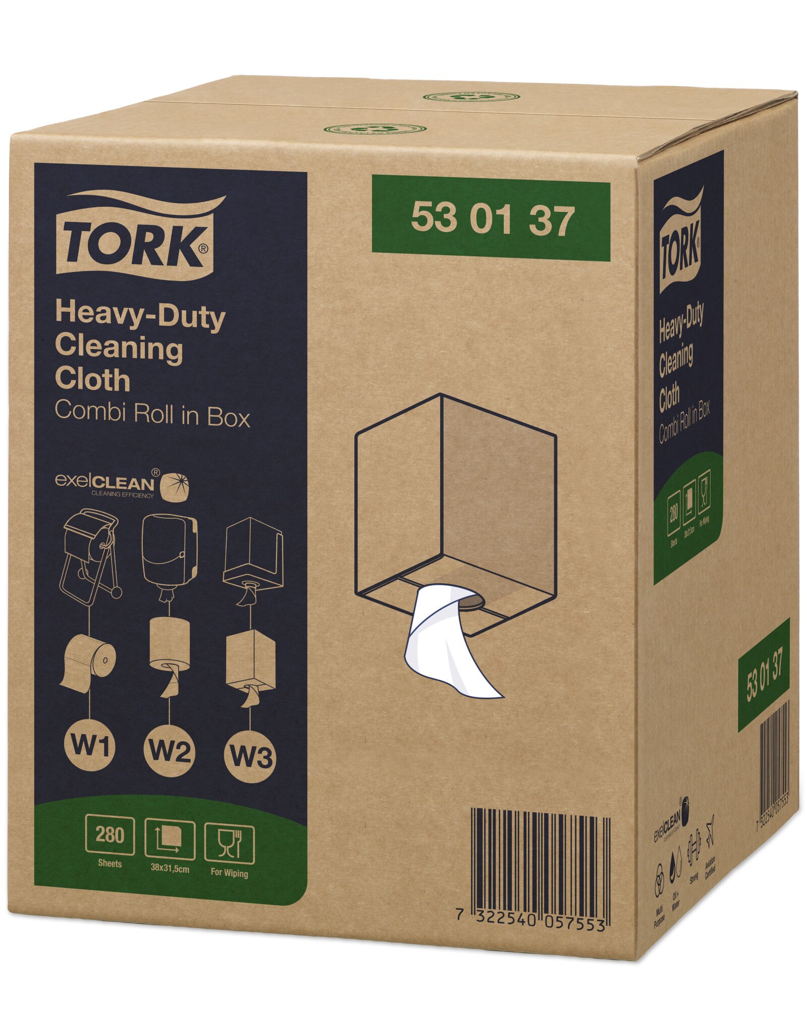 Víceúčelová Tork Heavy-Duty čisticí utěrka je vysoce absorpční, pevná a velmi trvanlivá, vydrží hrubé drhnutí, aniž by se roztrhla. Funguje v kombinaci s většinou rozpouštědel a rychle a účinně odstraňuje olej, mastnotu, vodu a nepoddajné skvrny a chrání přitom ruce před horkem a kovovými úlomky. Utěrky lze používat v Tork stojanech na podlahu W1 a v držácích rolí na zeď W1, které zaručují bezpečnost, účinnost a spolehlivost. Role jsou též kompatibilní s Tork Maxi zásobníky na role se středovým odvíjením W2, které jsou navrženy pro hladší dávkování jednou rukou. Využít lze také jednoduchý otevřený Tork zásobník na kombi role v boxu W3.