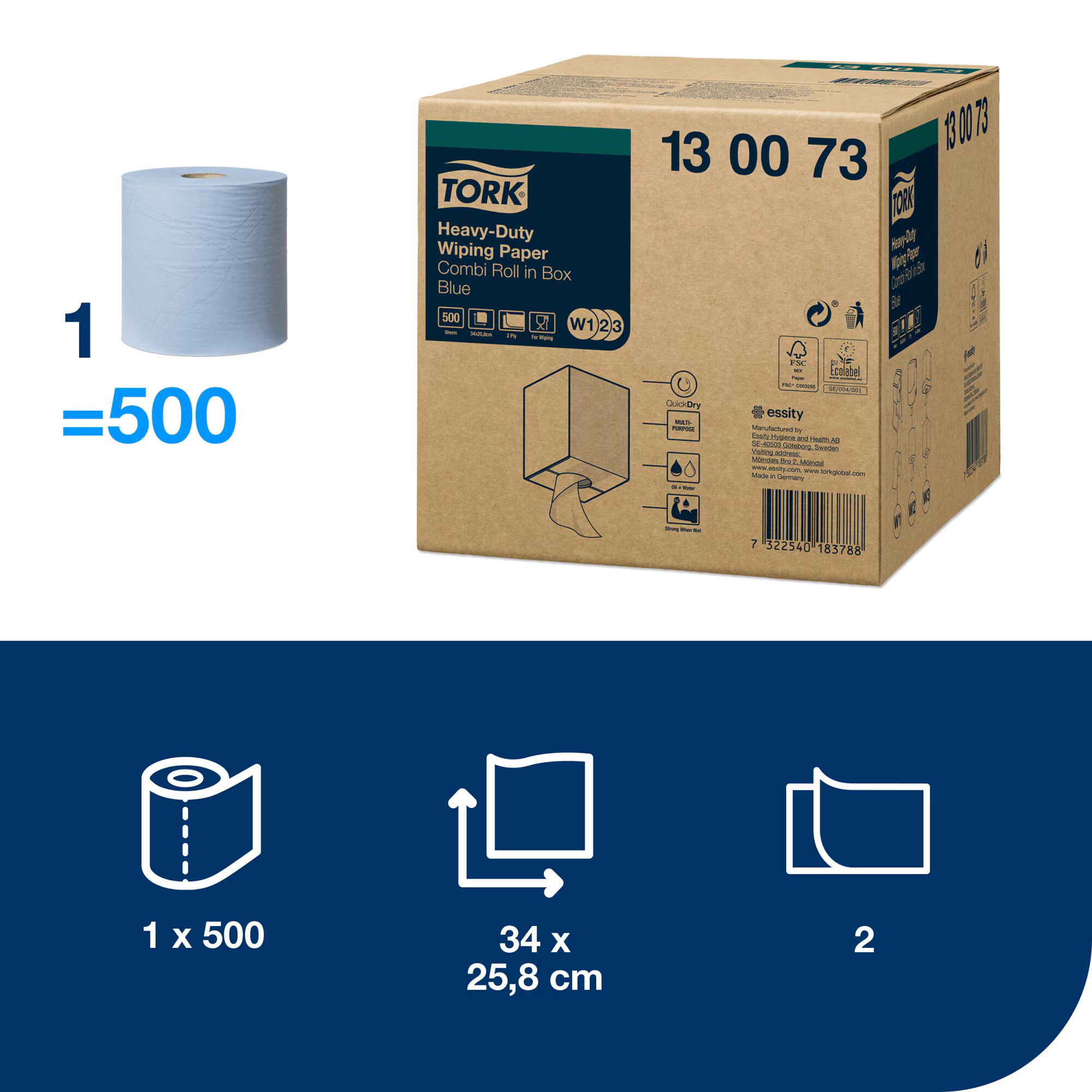 2vrstvá víceúčelová Tork Heavy-Duty papírová utěrka je ideální k utírání rozlitých tekutin i sušení rukou. Utěrky lze používat v Tork stojanech na podlahu W1 a v držácích rolí na zeď W1, které zaručují bezpečnost, účinnost a spolehlivost. Role jsou též kompatibilní s Tork Maxi zásobníky na role se středovým odvíjením W2, které jsou navrženy pro hladší dávkování jednou rukou. Využít lze také jednoduchý otevřený Tork zásobník na kombi role v boxu W3.
