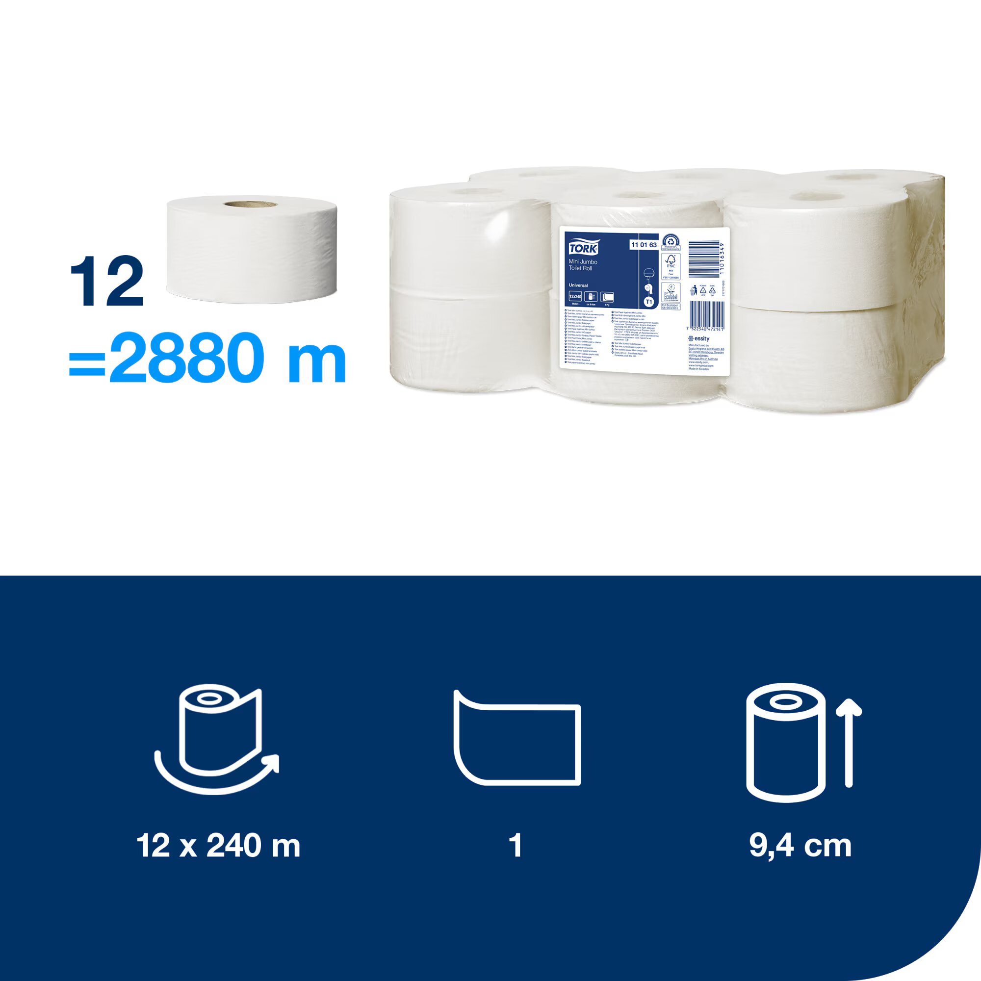 Tork Mini Jumbo toaletní papír Universal 1vrstvý nabízí skvělý poměr mezi náklady a kvalitou a je ideální pro provozovny se střední až vysokou návštěvností. Papír je kompatibilní s Tork Mini Jumbo zásobníky na toaletní papír T2, které vynikají časovou efektivitou a nižšími náklady a nabízí mnohem větší objem toaletního papíru než standardní role. Vysoká kapacita znamená méně časté doplňování.
