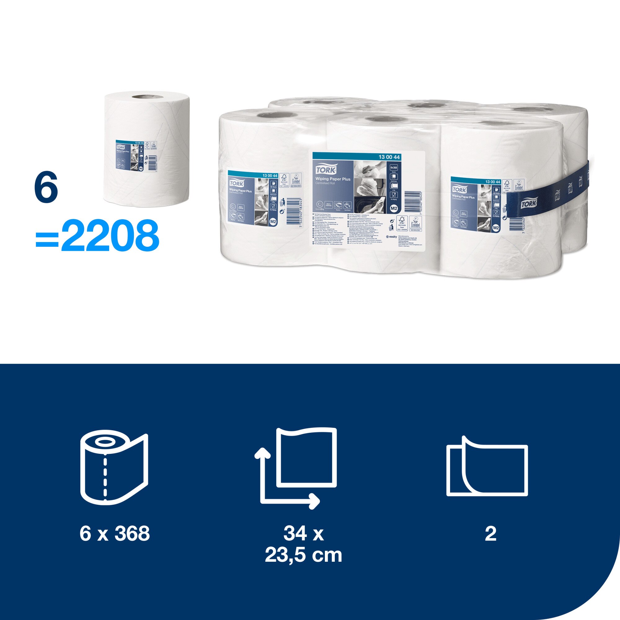 2vrstvá víceúčelová Tork papírová utěrka Plus je ideální k stírání rozlitých tekutin i sušení rukou. Tuto papírovou utěrku lze použít v Tork® zásobníku na role se středovým odvíjením M2, který představuje mnohostranné řešení s vysokou kapacitou pro profesionální prostředí, kde je zapotřebí utírání rukou i povrchů.