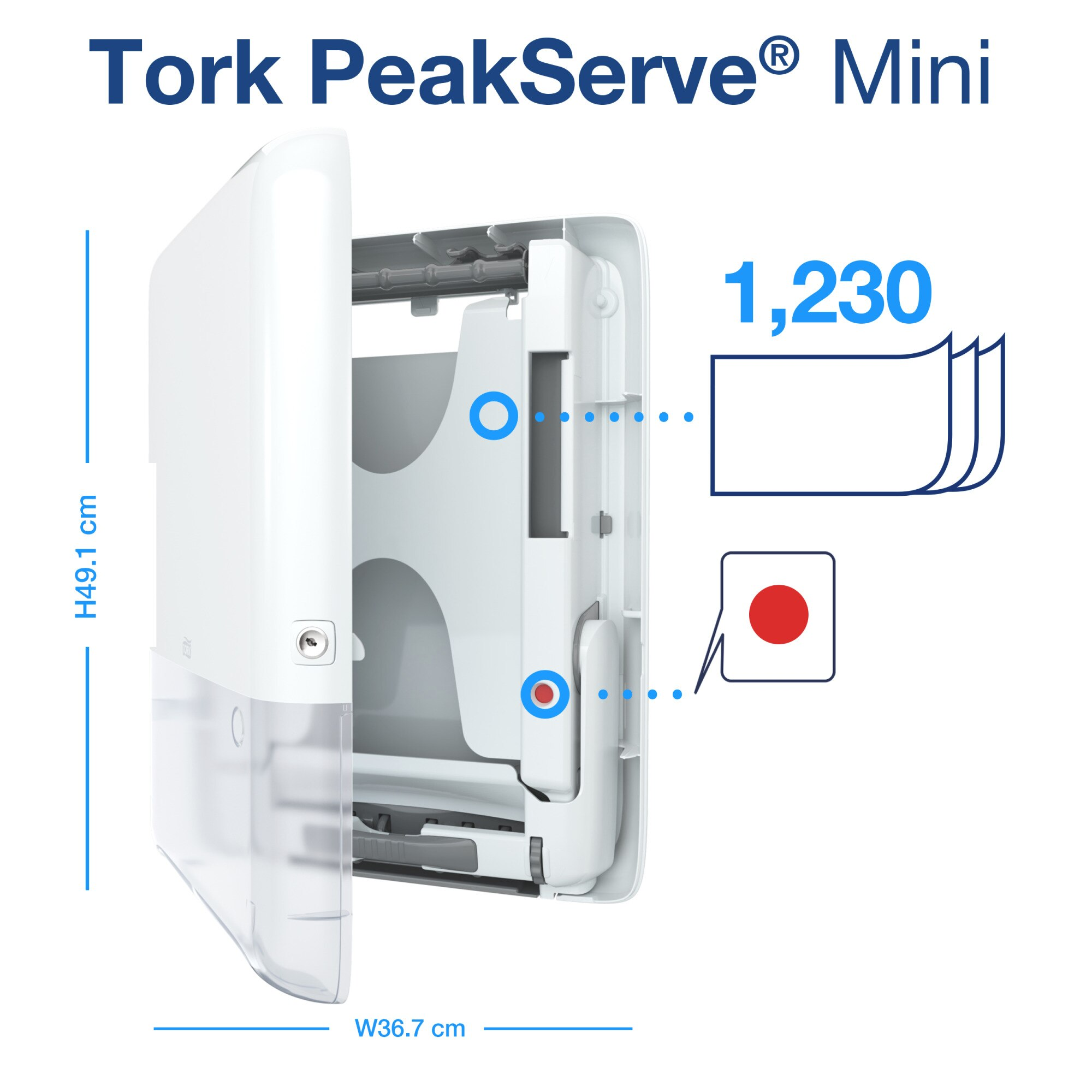 Systém kompatibilní s Tork PeakServe® jednovrstvými papírovými ručníky H5 má vysokou kapacitu více než 1230 ručníků s rychlým výdejem bez přerušení.