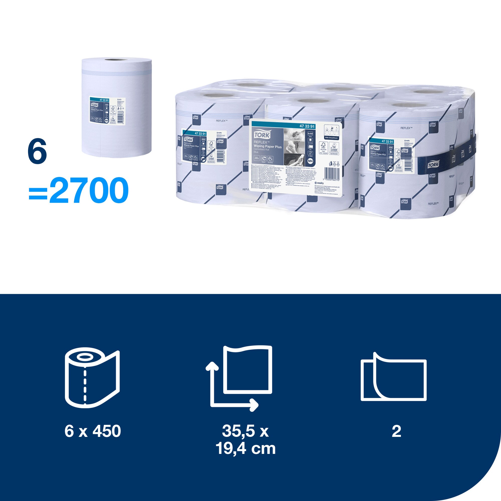 Dvouvrstvá víceúčelová papírová utěrka Tork Reflex™ Plus je ideální ke stírání rozlitých tekutin i sušení rukou. Tuto papírovou utěrku lze používat v Tork Reflex™ zásobníky na role se středovým odvíjením s dávkováním po jednom útržku M4, který se přizpůsobí pracovním tokům vašeho týmu, snižuje spotřebu a minimalizuje riziko křížové kontaminace.