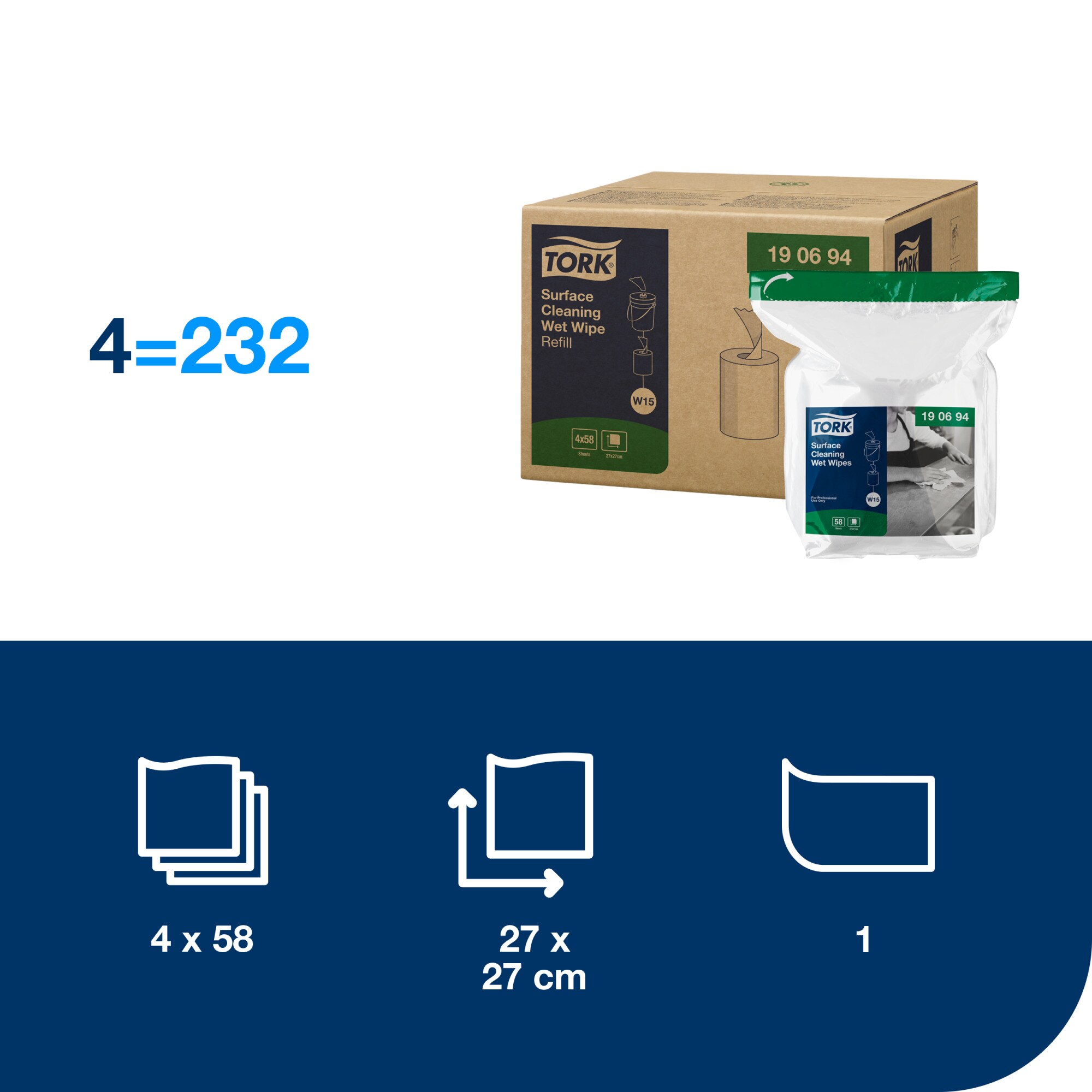 Utěrky lze použít jako náplň pro Tork vlhčené utěrky na čistění povrchy W15 (v kbelíků).